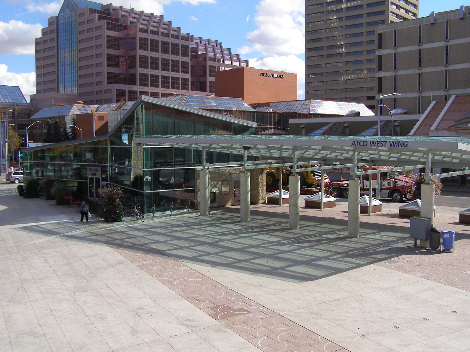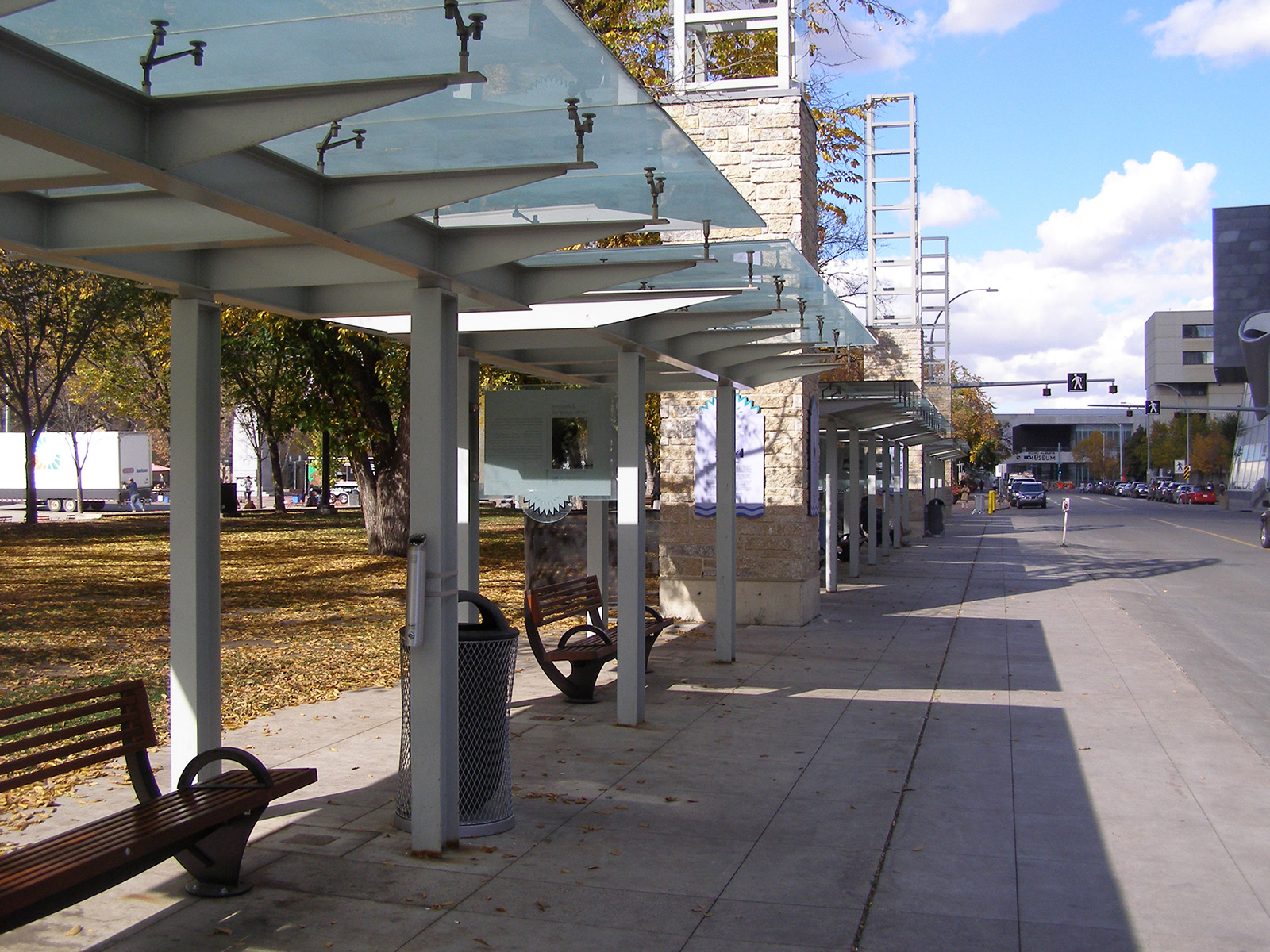 - Covered Walkway — The covered walkway provides shelter from the elements so that everyone can experience the plaza year-round.