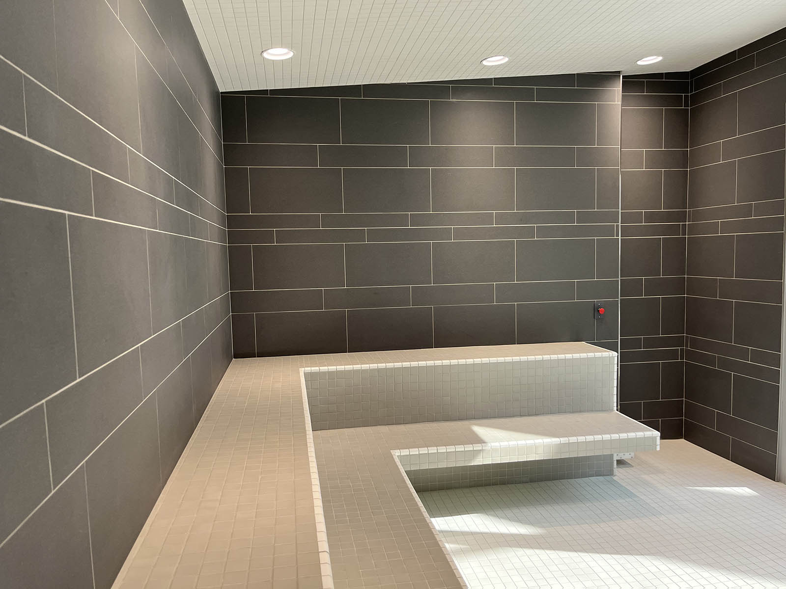 Inside the facility, testing of the pool basin, as well as building mechanical and electrical systems, is underway and the swimming pool is being filled. Outside the facility, landscaping work is nearing completion.